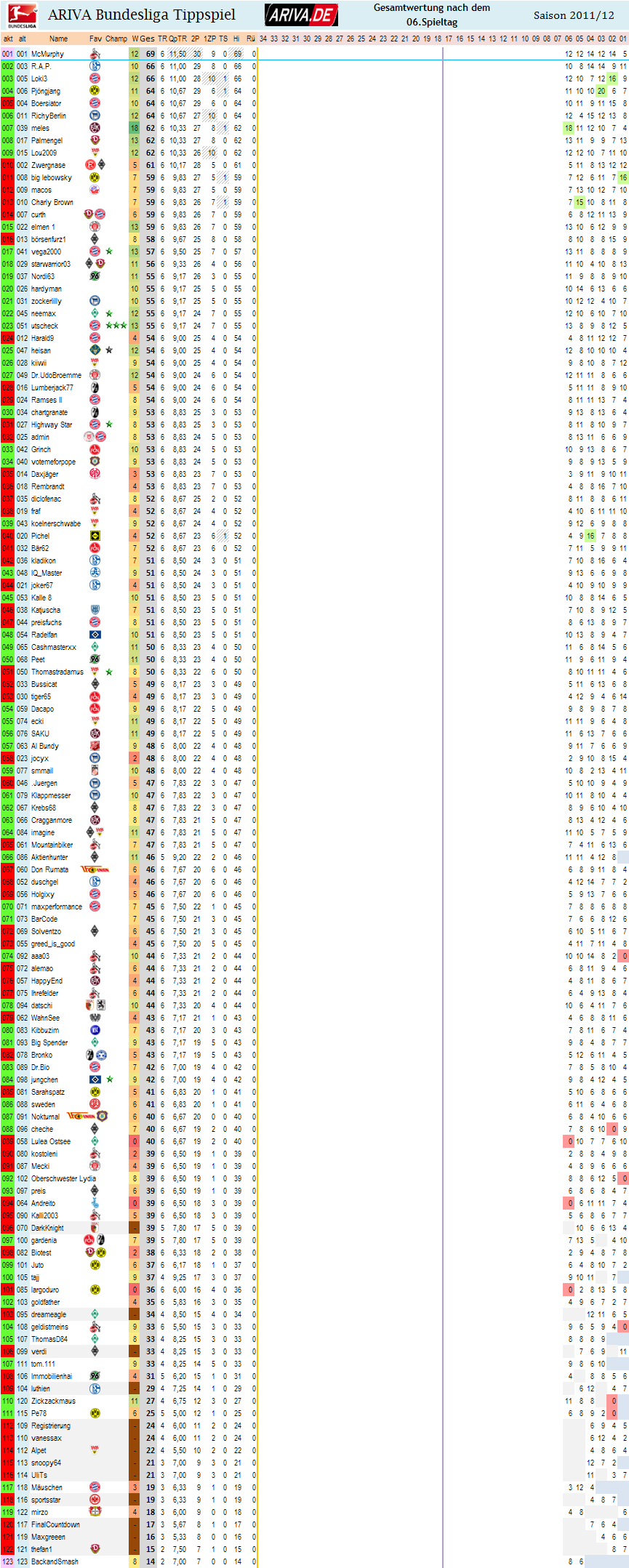 Gesamtübersicht: Stand nach dem 6.Spieltag
