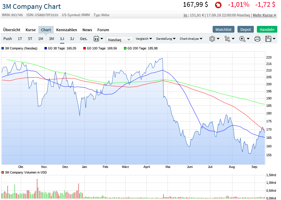 3M ist ein solider Wert, keine Frage, kämpft aber im Moment mit der Unterstützung bei 151,40 €. Wenn die 165 € (Widerstand) nach oben durchbrochen werden sollten, dann ist der Weg auf 200 € nicht mehr sooo weit.