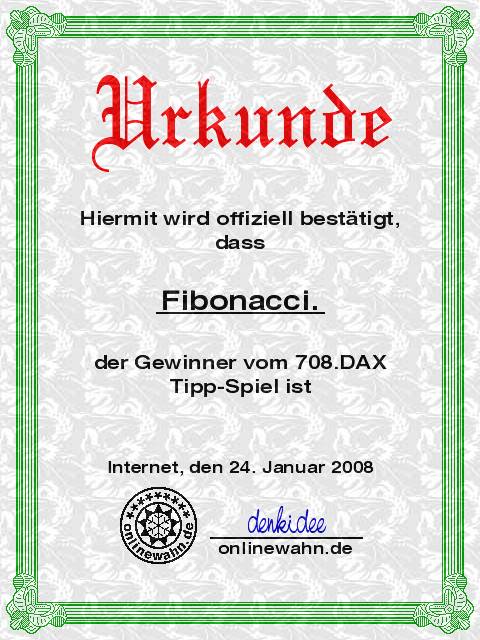 ...Der Gewinner ist Fibonacci. 708.DAX Tipp-Spiel­, Donnerstag­, 24.01.08, 17.45 Uhr, DAX 6.821,07