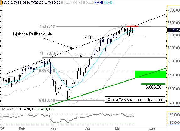 Charttechnischer Ausblick: Am heutigen Tag wird der DAX freundlich in den Tag starten. Die Handelseröffnung dürfte oberhalb von 7.500 erfolgen. Eine noch wirksame, sehr flache Abwärtstrendlinie kreuzt in der 1. Stunde bei etwa 7.522. Wird sie überwunden, kann sich möglicherweise eine typische Feiertagsrallye entwickeln. Ziele wären zu nennen bei 7.539/51 + 7.575/79. Aber Achtung! Der nach wie vor wirksame, markante mittelfristige Pullbacklinienwiderstand ist jeder Zeit gut genug, um eine große Korrekturwelle auszulösen. Das ganze Gegenteil, nämlich eine massive Kursexplosion ist in diesem Zusammenhang ebenfalls möglich. Bricht der DAX nämlich mit einem kräftigen Momentumpeak über 7.539/50 nach oben aus, kann das eine große Rallyebeschleunigung in Richtung 7.800 und 8.136+x einleiten. Ein Intraday Verkaufssignal würde sich heute unterhalb von 7.474 ergeben. Dies würde die Möglichkeit einer Intraday Abwärtsbewegung bis 7.418 eröffnen. 7.418 sind eine sehr starke Unterstützung. Fällt der DAX dennoch darunter zurück, so wäre der Weg frei bis etwa 7.366.