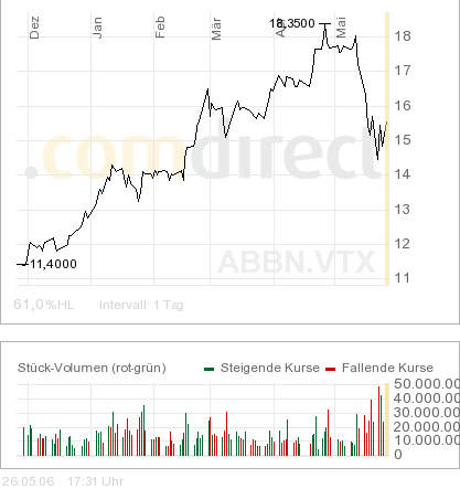 Seit der Heraufstufung der Analysten der Aktie auf "kaufen" am 28.07.2005 habe der Titel bis zum Schlusskurs vom 26.04.2006 die enormen 112,6% an Wert hinzugewonnen und sich damit auf Eurobasis um 90,7 Prozentpunkte besser entwickelt als der marktbreite EURO STOXX 600-Index. Man sehe unverändert ein sehr positives Marktumfeld für ABB, das sich vor allem aus steigenden Investitionen in den USA, Asien und dem Nahen Osten ableite.