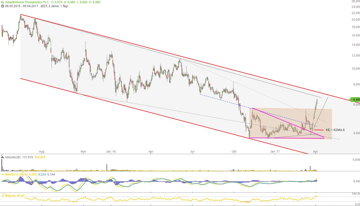 bestätigt ein Volumen von insgesamt 103 Millionen US-Dollar für Adaptimmune durch die beiden Kapitalmassnahmen, die nun einen Betrieb bis 'late 2019' sicherstellen sollen. Aktuell gibt Adaptimmune eine Finanzverfügbarkeit von 245 Millionen US-Dollar (nach 181,5 Millionen zum Jahresende 2016) an.