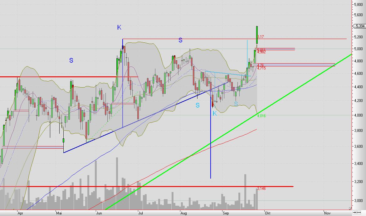 die 6€ könnte bei der Dynamik kurz zu erreichen sein. Vor 3 Jahren sind wir genauso schnell von 6 auf 4€ gefallen, warum nicht eine schöne Kurs-Kerze zur 6€ Marke, dort sehe ich auch den gleitenden Kursdurchschnitt der letzten Jahre.