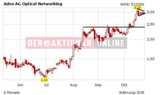 Der Münchener Netzwerkspezialist ADVA Optical hat vom französischen Netzbetreiber Covage einen Auftrag über die Installation von ADVAs FSP-3000-Plattform an mehreren Standorten erhalten. Der Netzbetreiber bietet zurzeit Ethernet- und Datensicherungs-Dienste mit einer Bandbreite von 1 Gbit/s an und plant bereits in Kürze die Steigerung auf 10 Gbit/s, was durchaus weitere Aufträge möglich macht. Finanzielle Details wurden nicht veröffentlicht, die Meldung bestätigt jedoch die Erwartung an eine anhaltend positive Auftragslage. so dass DER AKTIONÄR mit guten Zahlen zum dritten Quartal rechnet. Die Veröffentlichung des Q3-berichts ist für 29. Oktober geplant.