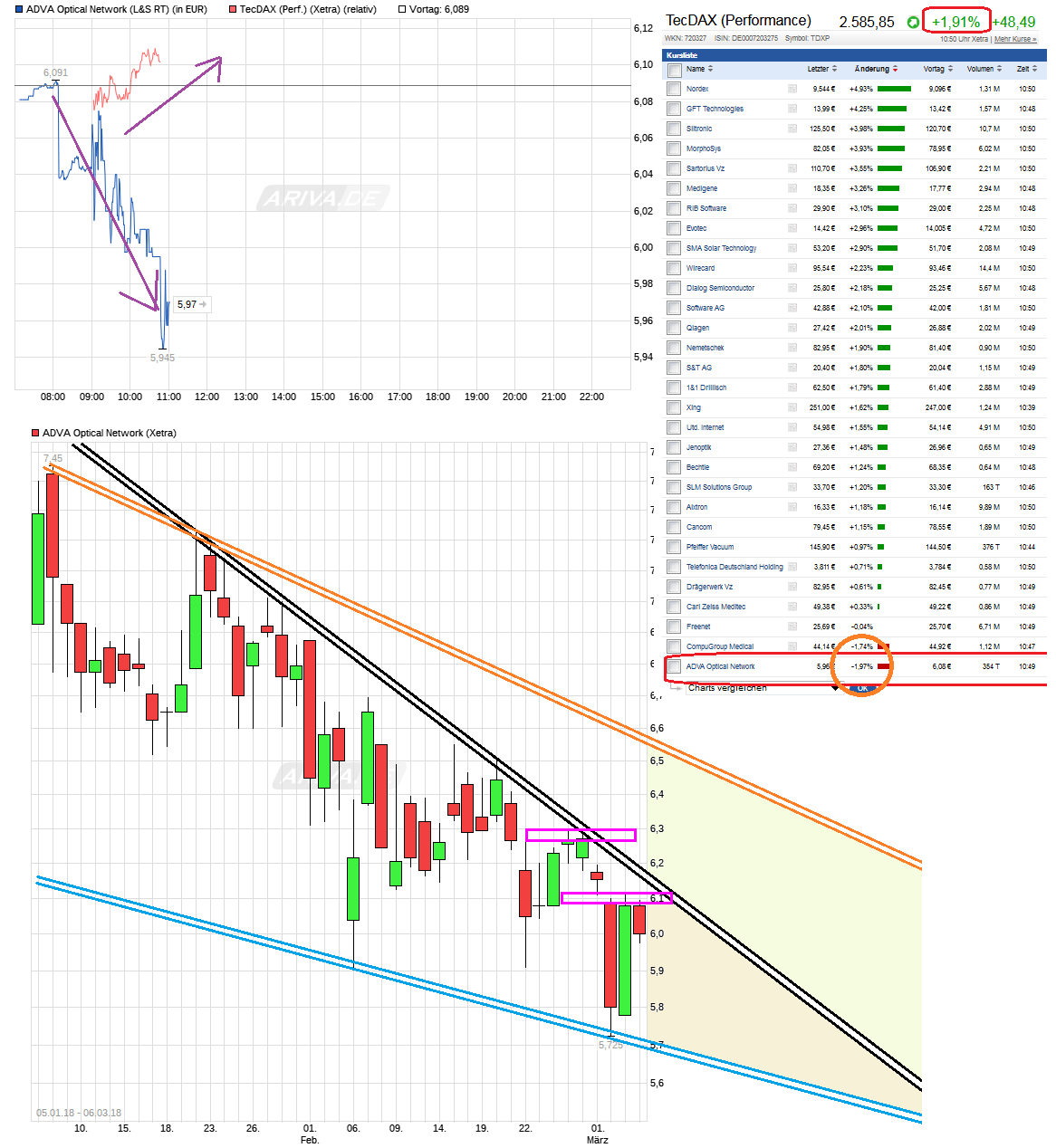 Der TecDax steht aktuell ca. 2% höher und ADVA hat mit der frischen Rauswurfmeldung im Rücken aktuell die rote Laterne mit ca. 2% Minus. Also es juckt genug Leute im Markt. Klar, der Rauswurf aus dem TecDax kam jetzt alles andere als unerwartet. Seit Wochen ist eigentlich so gut wie sicher, daß der Wert (genauso wie GFT) aus dem TecDax fliegt, weil man operativ zuviel Murks ablieferte in den letzten Quartalen und der Ausblick auf 2018 auch bislang eher bescheiden aussieht. Gleichzeitig hatten die potenziellen Kandidaten für den TecDax Aufstieg viel Kraft gesammelt. Abstieg aus dem TecDax ist negativ, weil man damit künftig wieder weniger Aufmerksamkeit erhalten wird, viele aktive Fondsmanager nur Aktien aus größeren Indizes überhaupt kaufen dürfen (DAX, MDAX, SDAX, TecDax) und bei passive Produkte auf den TecDax ( die den Index nachbilden) ADVA zwangsweise nun verkauft wird bei der Umstellung. Von daher dürfte es eine temporäre Phase geben, wo es eine gewisse Angebotserhöhung geben wird, auch wenn aktive Fondsmanager es vielleicht auch schon in den letzten Wochen z.T. bereits gemacht macht haben, weil der Rauswurf ziemlich sicher war. Es gibt aber sicherlich noch den schwer einzuschätzenden Faktor Leerverkäufer, die etwas die Nachfrageseite immer wieder schubartig erhöhen könnten, wenn sie denn ihre LV Position weiter abbauen ( wie es z.B. Marshall die letzte Zeit scheibchenartig machte, z.B. http://www.finanznachrichten.de/...position-weiter-abgebaut-358.htm). Die könnten den gewissen Angebotsüberhang durch die "normalen" Anleger nutzen, um schleichend zu covern ohne dabei den Kurs selber sonderlich nach oben zu treiben (anders also als vor einigen Wochen, wo man dadurch immer schnell über die 7 hochgeflogen kam). Ob die das im Bereich 5,90/6,00 machen oder doch erst bei tieferen Ständen wäre abzuwarten. Ansonsten gäbe es als größere Stütze weiterhin auf der Unterseite den seit Ende August 2017 steigenden Aufw.trend, der z.Z. bei ca. 5,30 liegt und stetig weiter steigt und noch die horizontale Unterstützung bei 5,63 vom Dez.2017. Denke das sollte nach unten auch erstmal weiter stützen, wenn nicht der Gesamtmarkt noch kollabiert oder ADVA bei den Q.1 Zahlen nochmal schwer zurückrudern muß. Problem ist auch wohl nicht so sehr eine große Absturzgefahr in meinen Augen, sondern die momentan fehlenden "good news", um den Kurs wieder nach oben zu bewegen. Die Abwärtstrends der letzten Monate sind erstmal weiter intakt. Schauen wir also mal wie es weitergeht und ob ADVA es doch schafft mit den Q.1 Zahlen etwas zu liefern was etwas besser aussieht als der Markt bis dahin erwartet.