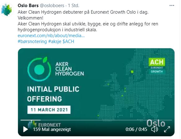 Aker Horizons hat kürzlich Aker Clean Hydrogen auf den Markt gebracht. Das Unternehmen wird die Produktion von reinem Wasserstoff in großem Maßstab entwickeln, bauen, besitzen und betreiben und verfügt über ein Portfolio von neun Projekten für reinen Wasserstoff mit einer Nettokapazität von 1,3 GW. Aker Clean Hydrogen hat heute ein hartes Börsendebüt. Die Aktie wird zu NOK 14,38 gehandelt, was einem Rückgang von 10,1 Prozent entspricht.