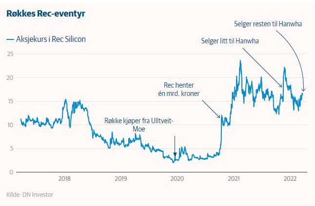 Diese Woche war besonders gut für die Røkke-Aktie, die um 30 Prozent zulegte, nachdem am Mittwoch bekannt wurde, dass das Unternehmen die restlichen Anteile an Rec Silicon verkauft hatte.