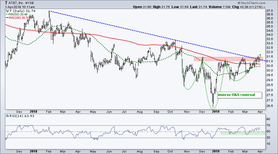 The inverse head-and-shoulders pattern is a bullish reversal pattern that marks a trend change (from down to up). The left shoulder formed from late October to early December, the head with the December low and the right shoulder with the February-March lows. The peaks across the pattern mark neckline resistance and a break above this resistance zone confirms the pattern.