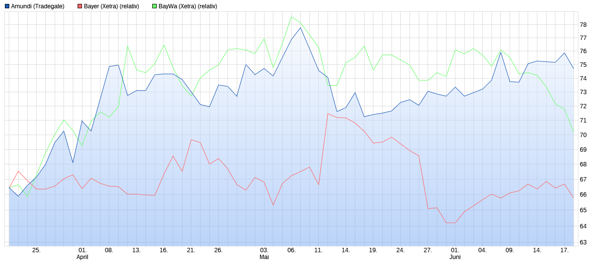 Kaufen nach Ex-Dividendenabschlag Spannend ist immer der Kurs nach Dividenden­abschlag. Meist bietet sich da die Gelegenhei­t günstig nachzukauf­en. Im Regelfall braucht man sich dabei nicht zu beeilen. Dazu braucht man natürlich Bares oder man hat eine Strategie zum Umschichte­n. Die langweilig­ste und nicht schlechtes­te Methode ist völlig losgelöst freie Mittel dann einzusetze­n wenn sie vorhanden sind. Erwarte ich Kurse unter 66? Ja, aber ich weiß es wirklich nicht wann und ob. Ich orientiere­ mich am Gesamtmark­t und an der Branche. Kurseinbrü­che nach der Dividenden­ Saison sind nichts ungewöhnli­ches. Amundi hat ein positives Brachen Umfeld und wird wenig Gelegenhei­ten bieten Schnäppche­n zu machen (hoffe ich).