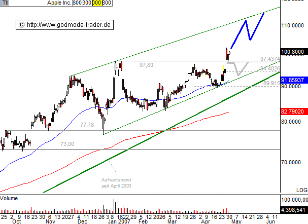 . Apple Computer - Kürzel: AAPL - ISIN: US0378331005 Börse: Nasdaq in USD / Kursstand: 100,80 $ Kursverlauf vom 19.09.2006 bis 30.04.2007 (log. Kerzenchartdarstellung / 1 Kerze = 1 Tag) Kurz-Kommentierung: APPLE gehörte in der vergangenen Woche zu den Gewinnern. Nach der Bekanntgabe des Quartalsberichts kam es auch hier zu einer klaren Aufwärtsbewegung. Das erreichte neue Hoch wurde dann aber zunächst verkauft. Auf dem gebrochenen Widerstand bei 97,80 $ beginnt die Aktie jetzt allerdings, nach oben abzudrehen. Damit bietet sich durchaus die Möglichkeit einer Rallyefortsetzung innerhalb des mittelfristigen Trendkanals in Richtung 110,00 $. Bei einem Rückfall unter 97,44 $ muss allerdings schnell mit Abgaben bis in den Bereich 94,48 $ gerechnet werden
