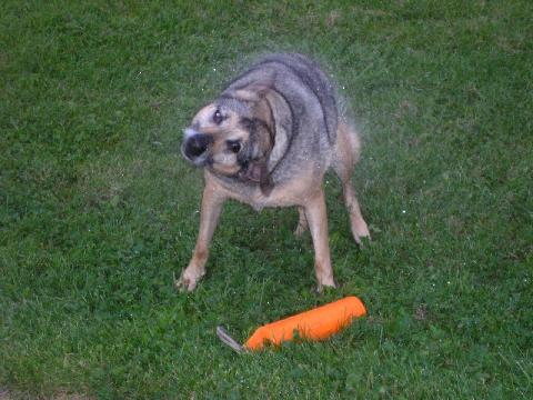 wurde sie von einem Auto angefahren und war wirklich sehr schwer verletzt. Wir haben sie operieren lassen. Ca. 8 Tage später hatten wir Urlaub gebucht in Bayern auf dem Bauernhof (ideal mit kids und Hund) und wir haben sie humpelnd mitgenommen... was willste machen. War schön... wir hatten von der Familie, bei der wir immer auf dem Bauernhof Zimmer gebucht hatten, eine Schubkarre bekommen, mit der wir sie überall hingezogen haben... *smile*...