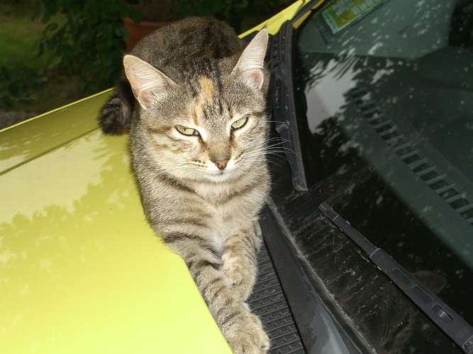 Kaum waren wir von unseren Tagesausflügen mit dem Mietwagen zurück, legte sich die Katze unserer Freunde zwischen Motorhaube und Frontscheibe.