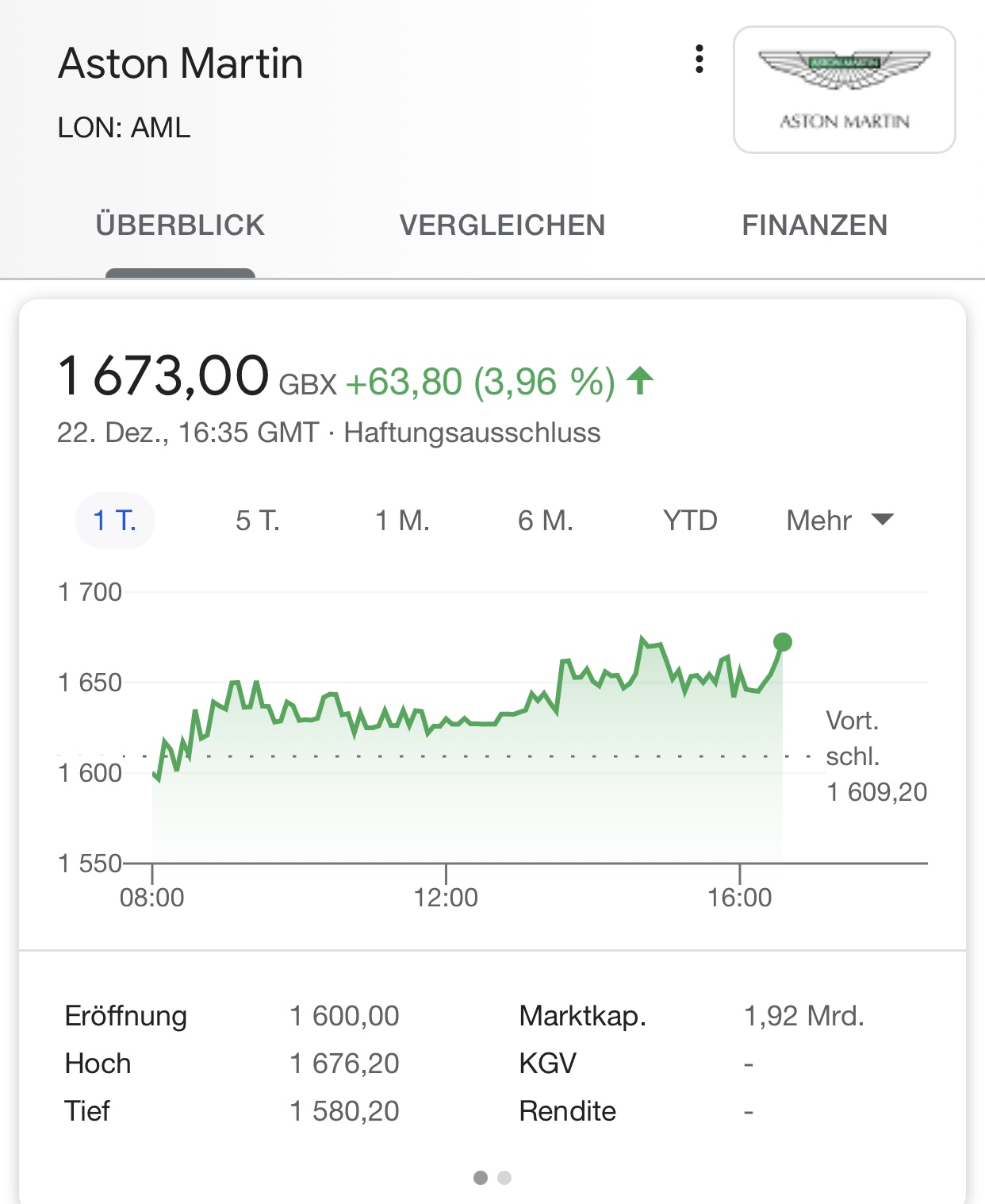 Ausschnitt aus der einschätzung( that would give Aston a market cap of £9 billion and Mercedes 20% being worth £1.8 billion.)Das hieße ca 80 euro in 2025,wenn es so passt