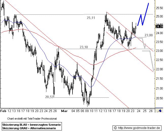 BASF - „A bissl was geht immer“ BASF - WKN: 515100 - ISIN: DE0005151005 Börse: Xetra in Euro / Kursstand: 24,39 Euro Rückblick: Die Aktie von BASF stellte den Bären am 06.03. und 09.03.2009 eine Falle, da sie unter die Marke bei 20,53 Euro abfiel, dann aber immer wieder darüber anzog. Diese Bärenfalle war das Startsignal für eine kräftige Erholung. Dabei zog die Aktie bis an den Widerstand bei 25,11 Euro an. An diesem Widerstand scheiterte die Aktie am 13.03.2009. In den letzten Tagen konsolidierte die Aktie in einer bullischen Flagge und fiel dabei auf die Unterstützung bei 23,10 Euro zurück. Heute morgen brach die Aktie in einer sehr starken Eröffnung aus der Flagge nach oben aus. Allerdings setzte nach einem Tageshoch bei 24,64 Euro sofort ein Pullback an die Flagge ein, welches aber am Nachmittag nach einem Tief bei 23,80 Euro bereits wieder gekauft wurde. http://www.godmode-trader.de/de/aktie-analyse/...119104,a1193107.html Charttechnischer Ausblick: Damit hat die Aktie von BASF nun die Chance auf eine Rallye bis ca. 25,11 und später möglicherweise sogar bis ca. 26,33 - 27,10 Euro. Sollte die Aktie aber wieder unter 23,80 Euro per Stundenschlusskurs abfallen, dann droht auch der Bruch der Marke bei 23,10 Euro. In Folge dessen könnte die Aktie dann über 10% an Wert verlieren und in Richtung 20,53 Euro abverkauft werden. Kursverlauf vom 10.02.2009 bis 21.03.2009 (log. Kerzendarstellung / 1 Kerze = 1 Stunde)