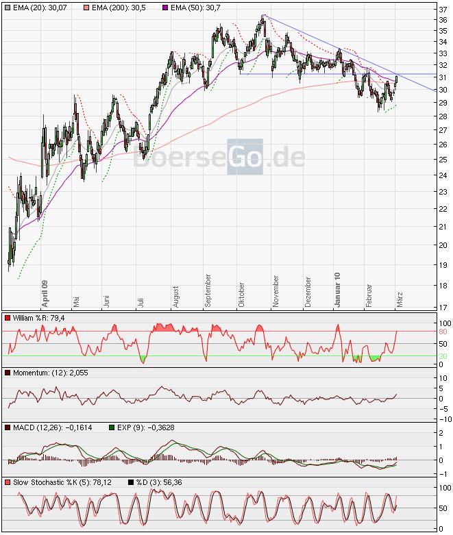 Die Aktie ist seit dem 26.02.2010 in einer Aufwärtsbewegung, die nach wie vor intakt ist. Einschränkend ist jedoch der CCI, der sich seit dem 09.03. in einer Seitwärtsbewegung oberhalb der Null-Linie bewegt.