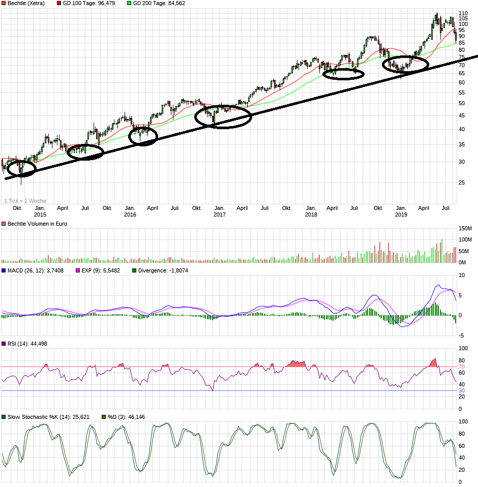 auf den 5 Jahres Zeitraum angesehen, sieht es mir so aus, das man besten immer so um noch besser unter der GD200 gekauft hat … wenn man den wochenmacd ansieht könnte das gut hinkommen mit Linie, GD 200 und den macd das man so im tieferen 80 er Bereich (zu)kauft. … Fundamental ist ja weiterhin alles bestens. (bis auf das hohe kgv;-)