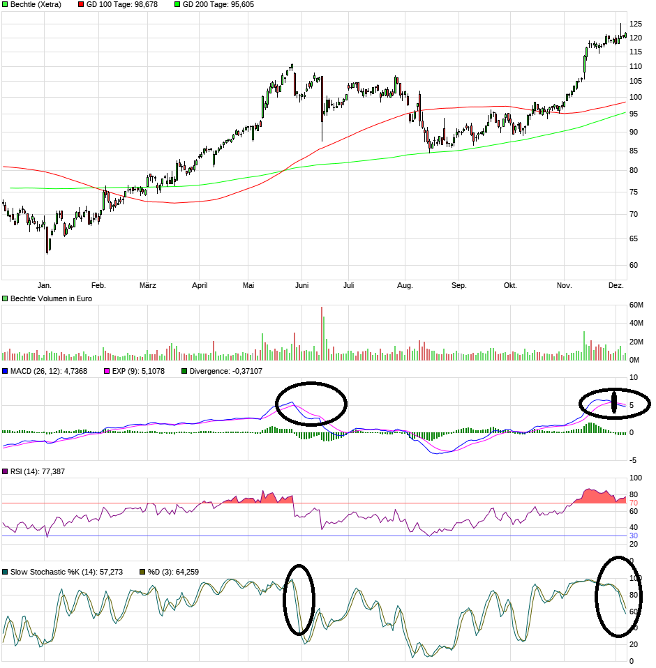 Alle chartechnischen Indikatoren weisen auf eine stärkere (gesunde) Korrektur hin. Man sollte daher den Zeitpunkt des Verkaufes nicht zu verpassen, da man sicherlich wieder günstiger einsteigen kann.