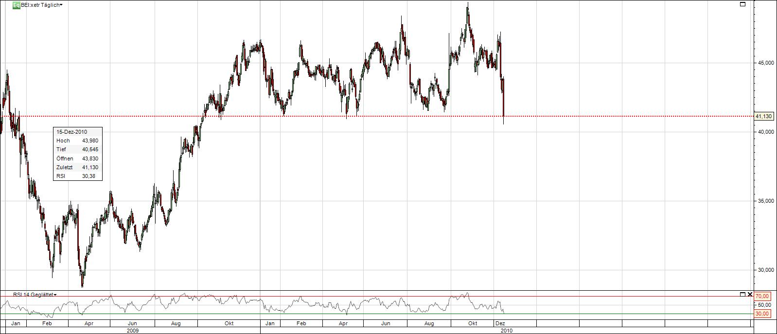 Die Aktie schloss gestern mit einem Minus von 5,7 Prozent und startete heute erneut mit Verlusten in den Handel. Den Investoren wurde in London eine operative Umsatzrendite der Nivea-Sparte von neun bis zehn Prozent für 2011 in Aussicht gestellt. Darin ist zwar der Effekt eingerechnet, dass unrentable Produkte aus dem Sortiment gestrichen werden, nicht aber die dafür nötigen Aufwendungen. Da die Straffung des Produktangebots erst am Anfang steht, dürften die Auswirkungen noch gering sein. 2009 lag die Rendite der Kosmetiksparte bei über elf Prozent.