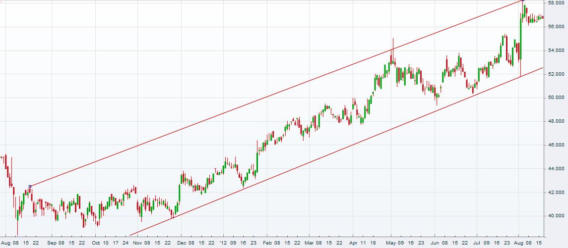 Aufwärtstrend hin oder her, die Aktie wird irgendwann wieder zurückkommen, und mindestens das Gap bei 57 € schließen. Kursziel 55,5 €.