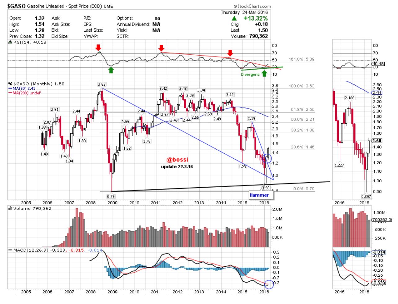 Gasoline (GASO ) monthly Chart mit Divergenz, Hammer (wie 2008) und Ausbruch aus dem fallendem blauem Keil .... http://stockcharts.com/c-sc/sc?s=%24GASO&p=M&yr=12&mn=0...