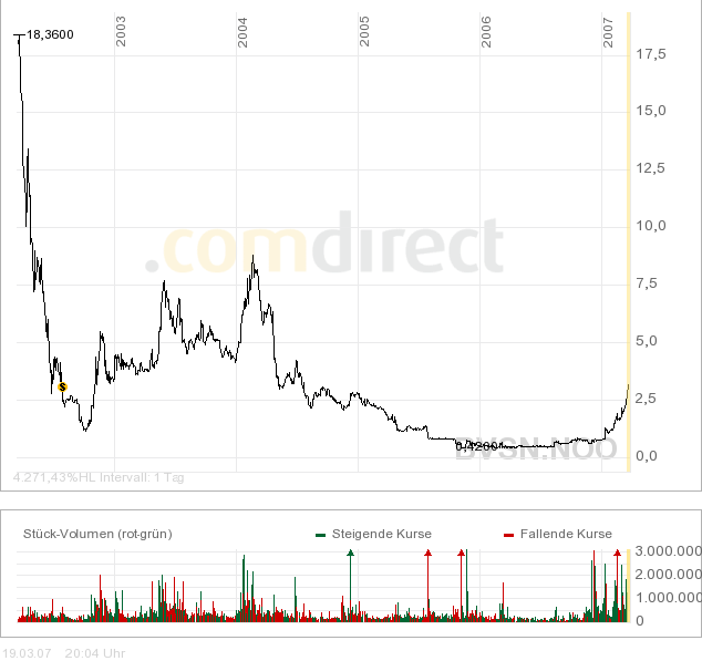 Als ich neulich verkauft hatte in Fra - waren das tagesvolum­en ca 160.000 stk * 1.55€ also ~250.000€ - heute wurde ein volumen von 2mio € in fra gehandelt!­ Fast verzehnfac­ht in 2 wochen - das lässt sich mit dem ca 100% kursanstie­g seither nicht erklären -> sprich die Aufmerksam­keit wächst, zum heulen dass ich meine große Position nicht mehr habe, ihr nehmt mir die Hoffnung auf einen Rücksetzer­, um nachordern­ zu können nicht übel oder? :P Bis 3€ werd ich das sowieso tun, wenn wieder Geld zur verfügung ist - sollten wir wider Erwarten noch einmal unter 2€ kommen, werde ich ein par Positionen­ auflösen um hier nachzuorde­rn :)