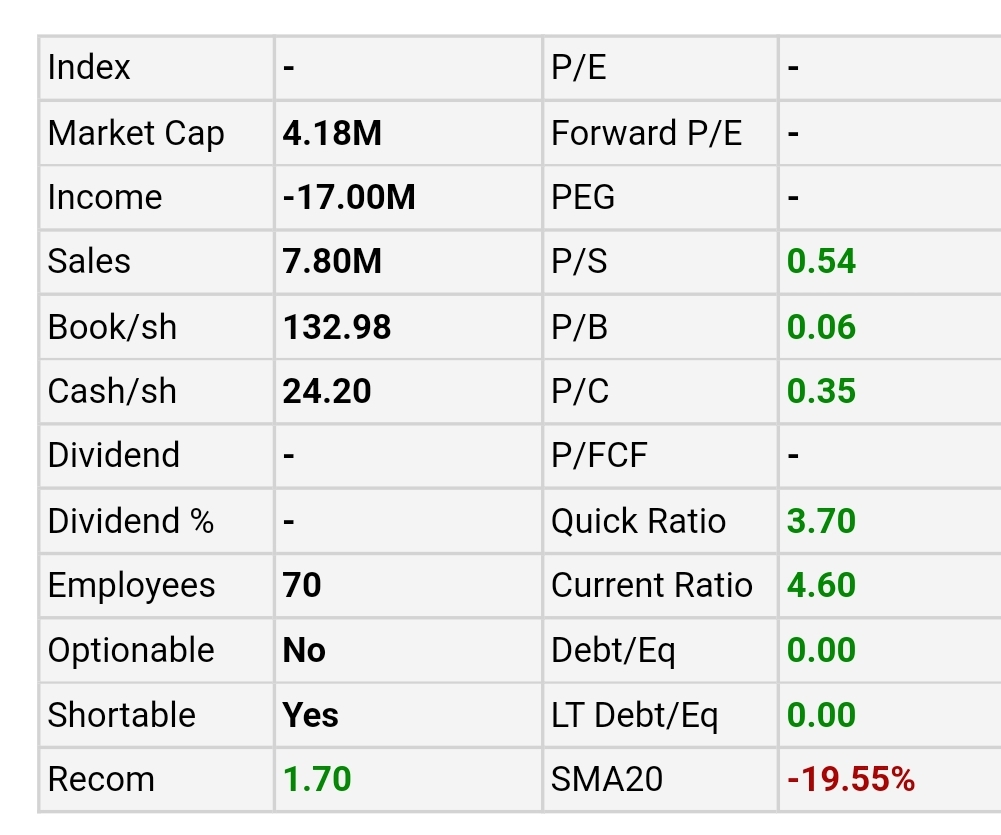 kurs nahe Allzeittief. Marktkapitalisierung sehr niedrig mit 4 Millionen. Haben gestern gute News veröffentlicht, dass der Umsatz zum letzten Quartel um 40% gewachsen ist. Der Float ist mit knapp 600.000 Aktien das geringste was ich an der Nasdaq gefunden hab.