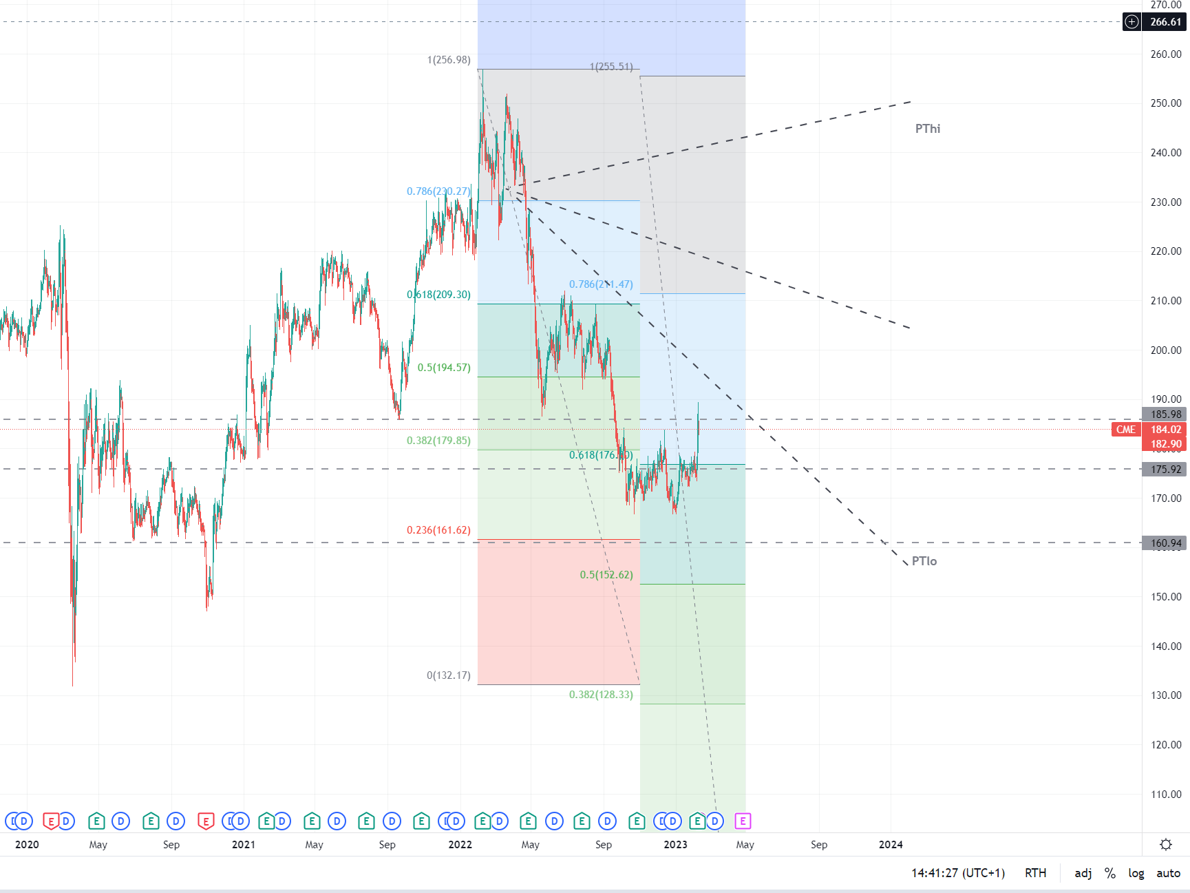 Fortschreibung des alten Chartbildes aus Mai 2022. Price Target-Linien muss ich noch anpassen, habe die aber jetzt extra mal so drin gelassen, damit man sieht, wie sich das ganze entwickelt hat. Das tiefe PT liegt jetzt schon unterhalb meiner gestrichtelten Tradinglinie/ nahe der Retracekante.