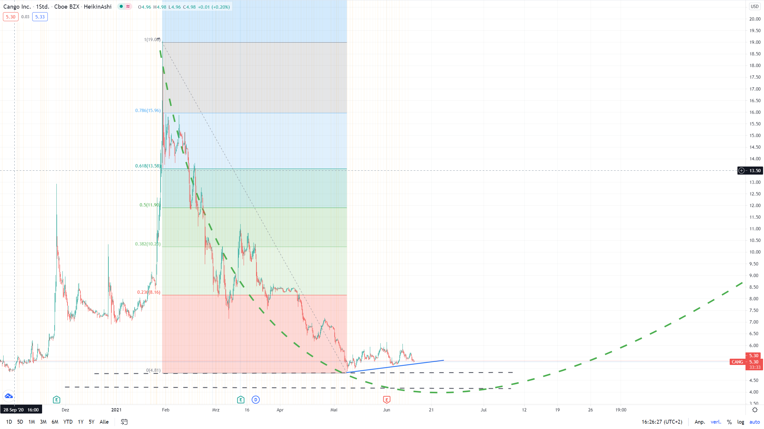 Der Wert ist auch ExChina gelistet. Bei der Kombi Ai- /IT-basiertes Fintech wäre ein Listing in China auch nicht so risikofrei (Regulierungsgefahr) aber man hat den Zockerdruck aus Shenzhen und HK halt nicht im Wert, somit dauert es eine Weile bis es die Kleinanleger erreicht. Daher spekuliere ich bei Cang auch noch weiterhin auf – 10%.