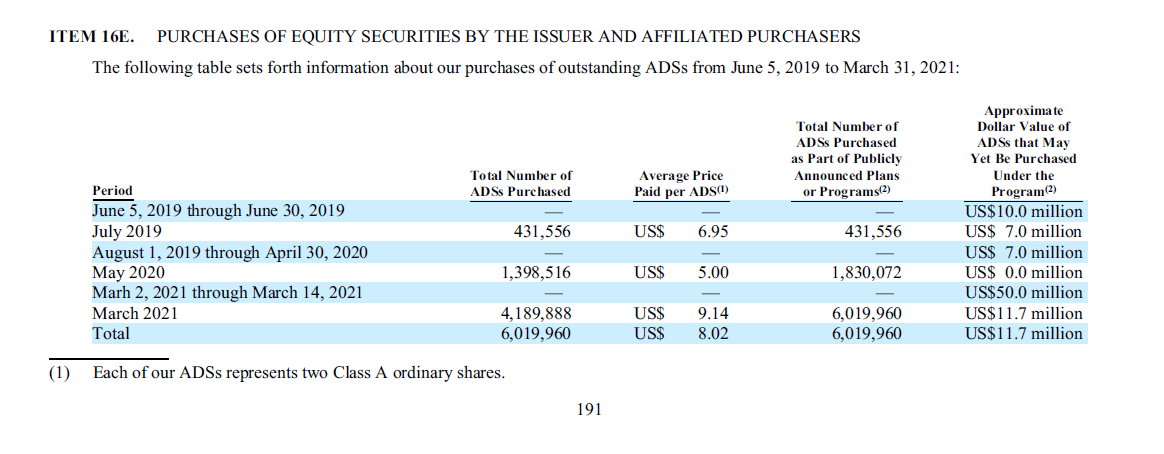 2. You may refer to attached Cango 2020 annual report(ITEM 16E) to get more details about our share repurchase program. (Auf Seite 191)