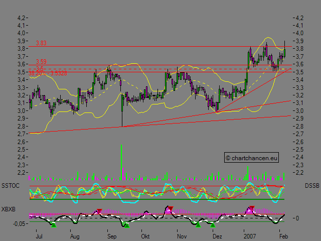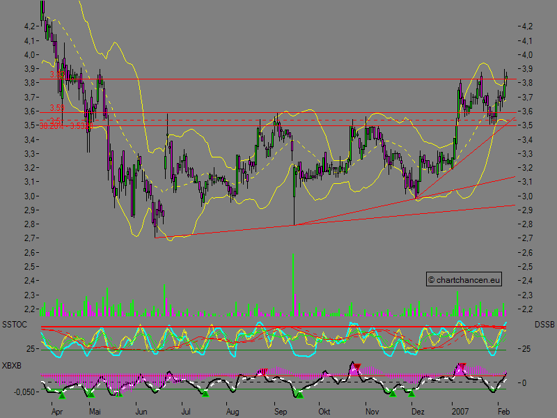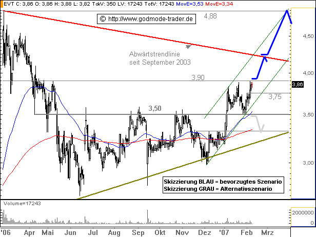 Die Aktie der Firma Evotec befand sich in einer Seitwärtsrange von Juni 2006 bis Januar 2007, welche eine Aufwärtsdreieckformation ausgebildet hat. Diese Formation konnte nun vermutlich zum Abschluss gebracht werden in dem die Aktie den Widerstand bei 3,59 € überwinden konnte.