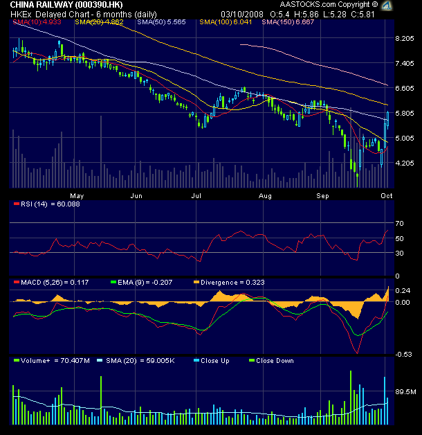 China Railway (0390) China Railway Construction will start the IPO process today. Initial response was extremely favourable. Shadow shares like China Railway will benefit from the euphoria. Buy $9.30 Target $10.00 Cut loss $8.50