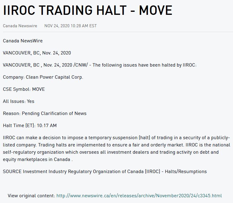Clean Power Capital vom Handel ausgesetzt.