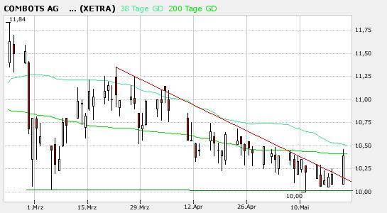Der Boden bei 10€ hat erstmal gehalten und der kurzfristige Abwärtstrend ist gebrochen. Sollte Combots jetzt über 10,50€ und damit über beide wichtigen gleitenden Durchschnitte gehen, könnte es mal wieder zu einem schnellen Schub gen Norden kommen.