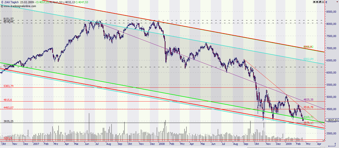 anbei der aktualisierte Chart. Bis auf wenige Punkte wurden gestern beide angestrebten Marken erreicht und der Dreh folgte auf den Fuß. Sollte heute ein positiver Tag werden, haben wir sogar die Möglichkeit für ein Candlestick-Kaufsignal im Tageschart. Das würde, zumindest für die nächsten Tage, die anfangs aufgestellte Vermutung bestätigen. Auf jeden Fall scheint es sich als richtig heraus gestellt zu haben, nicht Hals über Kopf unter 4ooo Punkten zu verkaufen. Shorts sollten vorerst überdacht werden (eventuell Tagesschluss abwarten), zumal die Amis gestern ein Kaufsignal generiert haben, ebenfalls an einer sehr wichtigen Marke.