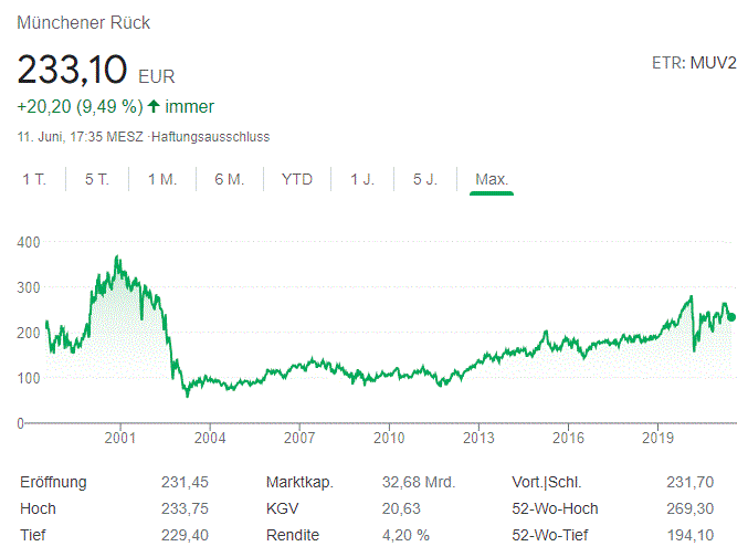 Die Münchener Rückversicherung steht schon seit langem auf meiner Watchlist, aber zu einem Einmalkauf kam es aus 1000 Gründen bisher noch nicht und angesichts der aktuell hohen (bzw. hoch erscheinenden) Marktbewertungen bleibt es auch dabei. Doch ab Mitte August werde ich mit einem Aktiensparplan einsteigen, um zumindest den Fuß in die Tür zu bekommen. Grund ist - grob zusammengefaßt - zum einen die ordentliche Dividende und zum anderen meine Überzeugung, daß Rückversicherungen ein nachhaltiges Geschäft sind, so daß man hier die Buy and Hold-Strategie fahren kann.