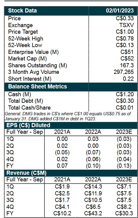 Holding price target steady at C$1.00 and maintaining Buy rating.Although bitcoin price closed January 2023 with a strong monthly gain,we await greater stability in the crypto-verse and macro environmentprior to adjusting our 2023 outlook here. Our C$1.00 price target isbased on a 5.5x price-to-sales ratio we see fair in light of DMG's growthand business diversity. An investment in DMG Blockchain comes withrisks associated with dilution, software development, crypto operations,bitcoin mining and hosting, market pricing, and dependence on partnerrelationships.