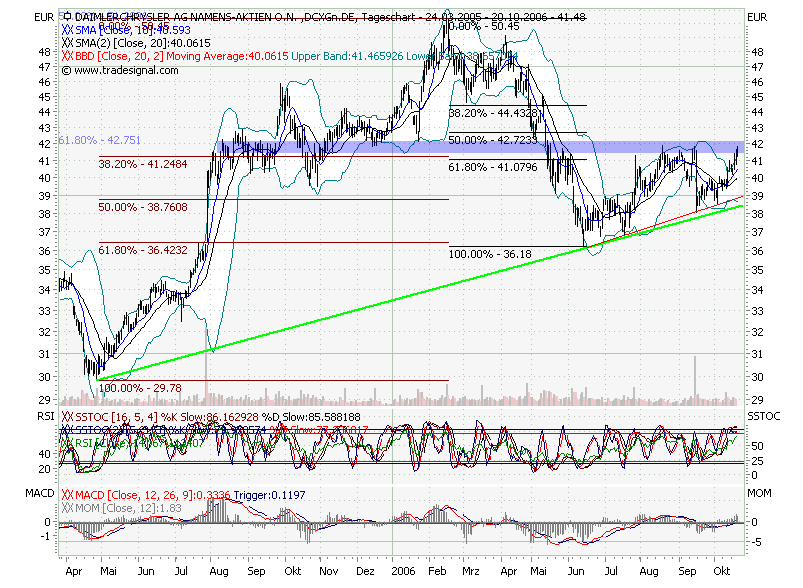 Der Aktienkurs von DaimlerChrylser legte nach Bekanntgabe der Quartalszahlen um 5% auf 43,58 EUR zu. "Das sieht alles sehr gut aus und hat die Bedenken des Marktes hinweggefegt", sagte ein Marktteilnehmer. Auch die Prognosen hinterließen einen guten Eindruck. Laut Händlern hatte der Kapitalmarkt eine negative Erwartungshaltung. Allerdings hätten die Zahlen nicht "den Befürchtungen entsprochen". Dies habe zu Shortcovering geführt.