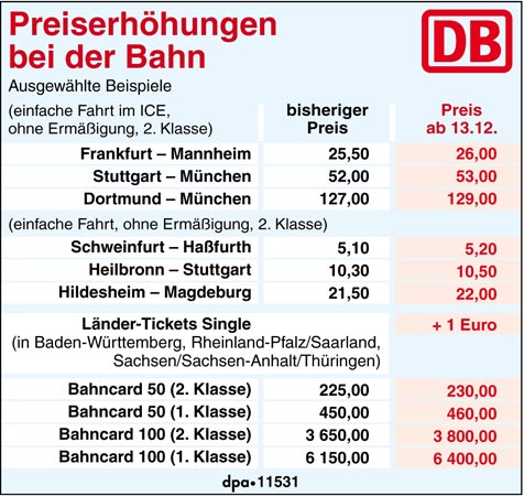 Wer sich für 66 Euro einen Fahrschein beim Discounter kauft, erhält nur bedingt ein Schnäppchen. Zwar gilt dies für eine Hin- und Rückfahrt in Deutschland und Österreich in der 2. Klasse, doch das nur vom 4. Januar bis 31. März. Zudem darf nicht freitags gefahren werden und ein Umtausch sowie eine Erstattung der Fahrscheine sind nicht möglich. Erhältlich sind die Tickets bis zum 13. Dezember in den Lidl-Filialen solange der Vorrat reicht . Also doch wieder traditionell buchen? Ja, doch teurer. So erhöht sich der Preis beispielsweise für die Bahncard 50 der 2. Klasse um fünf Euro auf 230 Euro. Der Preis für die Bahncard 25 bleibt bei 57 Euro. Die Ländertickets für Singles werden in sechs Bundesländern um einen Euro teurer. Der Konzern begründete die Anhebung vor allem mit deutlich gestiegenen Personalkosten in den vergangenen Jahren.