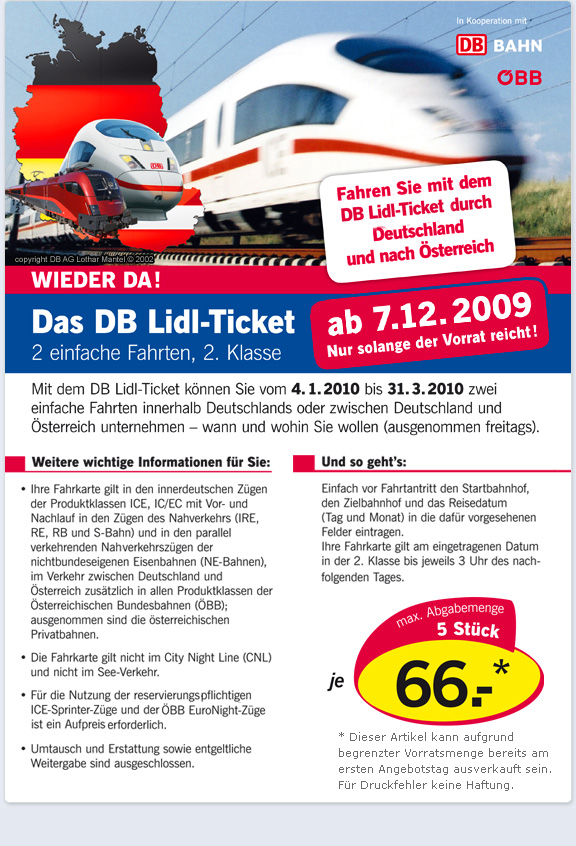 (Berlin, 1. Dezember 2009) Hin und zurück durch Deutschland und nach Österreich für 66 Euro: Der Verkauf des DB Lidl-Tickets startet am Montag, 7. Dezember, in allen Filialen des Lebensmitteldiscounters in Deutschland. Ein Fahrkartenheft enthält zwei einfache Fahrten in der 2. Klasse. Sie gelten jeweils für eine beliebig weite Strecke innerhalb Deutschlands sowie für Fahrten nach Österreich, zum Beispiel mit dem railjet der Österreichischen Bundesbahnen (ÖBB) zwischen München und Wien.