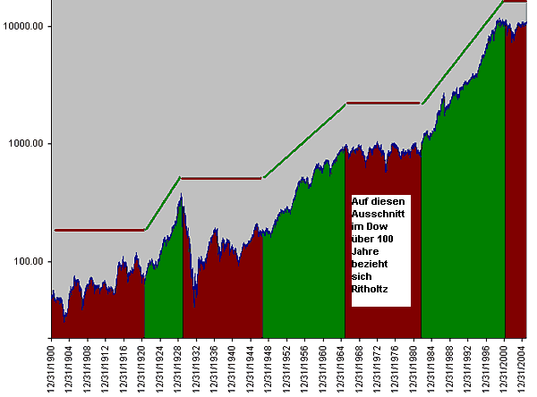 Ritholtz' These ist, dass die derzeitige "technische Erholung" der Aktien-Indizes ab März 2003 (Beginn des Irakkriegs) sich nun ihrem Ende nähert - vergleichbar dem 32-monatigen Anstieg von Mai 1970 bis November 1973 (schwarzer Pfeil) in der Grafik unten (zweite grüne Linie). Nun soll, nach Ritholtz, die Abwärtsbewegung folgen, die den DOW auf 7000 runter bringt (rot, darauf folgend).