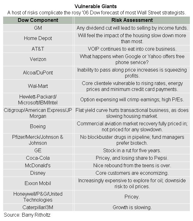 What would have to occur for 2006 to be the strong year for the Dow many are expecting? Forget Goldilocks, we would need a Cinderella scenario, where nothing goes wrong, and many things go precisely right: Earnings must stay robust, while energy prices and inflation moderate. The consumer would have to keep spending, despite signs of tiring. Businesses would need to build on third-quarter capex spending, and begin to hire in earnest. All of the vulnerable Dow stocks would have to avoid their major issues, or even a minor hiccup.
