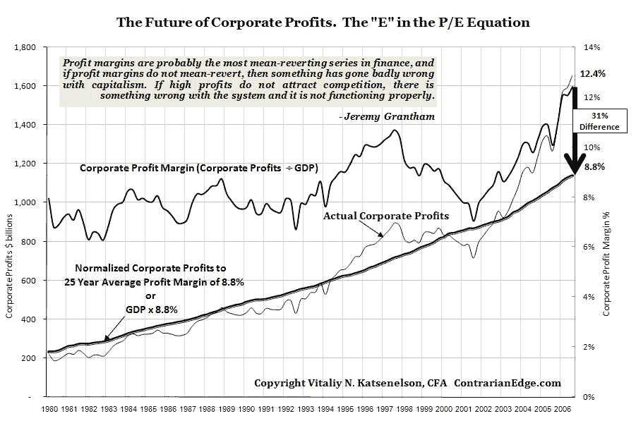 The chart below, prepared by ContrarianEdge.com's Vitaliy Katsenelson, graphically depicts how high current corporate profit margins are above trend line.