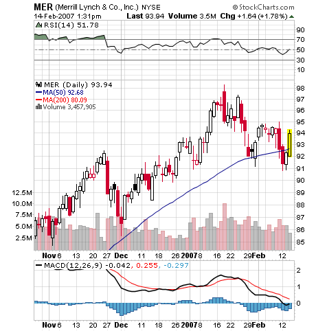 "Last May," Jeff remarked this morning, "MER peaked on the day the company announced record earnings. It then dipped below its 50-day moving average and ultimately lost 20%. The S&P 500 followed shares of MER lower and gave up 8%. Last month, MER peaked on the day the company announced record earnings. Last Friday, it dipped below its 50-day moving average. Does anyone care to guess what should come next?"