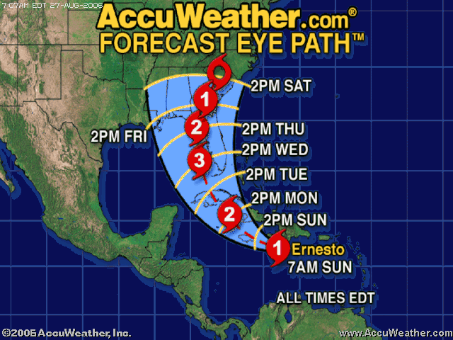 Nach derzeitigen Daten wird der Sturm eine Stärke von max. 3 erreichen (Skala geht von 1 bis 5). Da das Wasser in der Karibik und im Golf von Mexiko wegen der Rekordhitze in USA jedoch sehr warm ist, könnte sich Ernesto auch schnell noch weiter hochschaukeln. Ähnlich überraschend (über Nacht) schwollen letztes Jahr Katrina (New Orleans) und Rita (Texas) an. Rita erreichte beim Weg durch die Ölplattformen im Golf von Mexiko sogar teils die Monsterstärke von 5, obwohl der Sturm "moderat" begonnen hatte.
