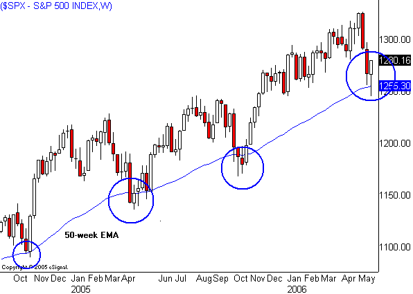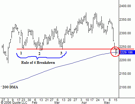 A look at the Nasdaq 100 shows that the index knifed below its 200-day moving average without as much as a pause. Note the Rule of Four breakdown as the Nasdaq 100 (NDX) broke triple bottoms from January, February and March. Note also that the recent waterfall came from a third lower high (my Power Surge Pattern) put in on May 8 as the Street was cheering the "breakout" in the S&P and the "obvious" move by the Dow Jones Industrial Average to new all-time highs. The market was talking.