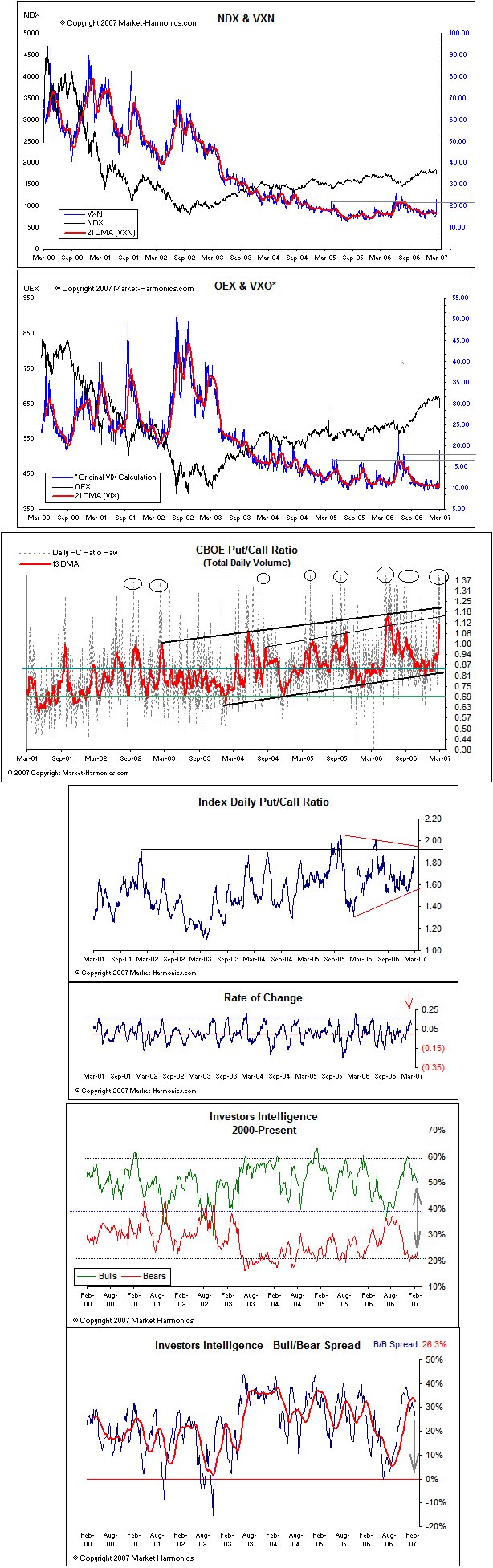 "While, yes, it is possible we can get a recession in the latter months of 2007, most forecasters are not making that judgment and indeed are projecting forward into 2008 ... with some slowdown."Those ain't exactly fightin' words. Then there's the timing issue. His comments were made early Monday morning over satellite to a group of Hong Kong investors. It was subsequently reported by Bloomberg and others. By 6:49 am on Monday morning, I had already blogged it, noting tongue in cheek that "Greenspan Forecasts Recession (Market Expected to Rally)." As noted above, Chinese markets rallied, and the US markets were flat on Monday. So to blame what happened Tuesday on Greenspan's comments hardly makes sense. 3. Blame China's market crash. On Tuesday, China's main indices were off 8.8%. However, it is doubtful this is what led to the cascading selloff in the US. Why? Most local markets in Asia were off only modestly. The Hang Seng (-1.76%), the Kospi (-1.05%) and the Nikkei (0.52%) all had minor losses. (Note that some Asian markets close earlier than China's.) Second, consider this fact: The combined value of China's Shanghai and Shenzhen stock markets -- the total market capitalization -- was $400 billion at the end of 2005. Over the next 14 months, it nearly tripled. Gains over the past six months were especially strong. After Tuesday's 8.8% plunge, the combined market cap was a mere $1.4 trillion, vs. $400 billion at the end of 2005. To put that into some context, the NYSE's cap is $22.3 trillion, and the Nasdaq's cap is $4.2 trillion. Add in the Amex and other markets and the total US market cap is north of $27 trillion dollars. By my back-of-the-envelope calculations, our 3.5% correction wiped out nearly a trillion dollars in US market capitalization, or more than two-thirds of the entire capitalization of both of China's exchanges combined. I doubt Communist China's relatively small public markets alone are responsible for what happened here. 4. A Dow Jones Glitch caused the plunge An absurdly false statement. By 2:55 p.m. EST, the Dow was off 295 points, the Nasdaq was down 95 and the S&P 500 was off over 3%. Indeed, trades in the Dow Diamonds and all 30 individual Dow Components were being reported correctly. Only the index (".INDU" on ILX or Bloomberg) was lagging. Once the glitch kicked in around 3:00 p.m., most of the damage had already been done. Indeed, until that time, the glitch actually made trading look more orderly then it was. When Dow Jones switched to its back-up server, it rammed nearly an hour's worth of lagging reports through in just a few moments, moving the selloff from mild to wild in 60 seconds. 5. We got fluctuated! On "Kudlow & Company" Tuesday evening, and then again in a Wall Street Journal editorial on Thursday, my pal Larry Kudlow went to the infamous J.P. Morgan quote, saying "Prices fluctuate." Maybe, but prior to Tuesday, volatility had been nearly abolished and markets had only moved one direction -- higher. I mentioned this market was challenging J.P. Morgan's notions with its lack of volatility. When Kudlow corrected me -- "Morgan said Fluctuate, not Volatility" -- I replied "We got fluctuated pretty good on Tuesday." And as I am writing this on Friday, we seem to be getting fluctuated pretty good again today. 6. Stock prices will be higher six months from now. This one is only half wrong: Based on prior one-day selloffs of 3% and 4%, what is most likely is that we will see higher and lower prices over the next six months to a year. So unless you plan on buying stock and then hiding on a desert island, prepare yourself for some big price moves. Consider 1997: From Oct. 16 to Oct. 24, the market suffered three days where prices were down between 2.5% to 3%. The next trading day (Oct. 27), the Nasdaq dropped about 100 points (-6.2%). The day after saw a gap down of another 75 points, but then the market rallied, closing up over 9%! Some more upward progress was followed by an 11% setback. The washed-out markets set up a 30% rally by April 1998. A similar pattern occurred in 1998. April 6 and 7 saw 1.7% and 2% drops, respectively, followed by oversold conditions, leading to a 10-day rally of about 7%. That set up some wild market swings over the next six months: a 10.7% selloff, an 18.2% rally, a 27.2% selloff. From there, we saw a near 20% snapback, leading to a 23.6% correction, and by Oct. 8, 1998, the markets had erased the gains for the entire year and then some. The deeply oversold conditions led to a rally that was up about 60% by the end of 1998, and tagged an 86.7% gain on by Feb. 1, 1999. December 1999 and January 2000 saw several 3% down days. The market peaked on March 10, and two days later suffered a 6% (peak-to-trough intraday) whack. The next day was another hit of near 4%. These moves set 2000 up for what would turn out to be one of the wildest years in market history. From that March peak to the beginning of April, the Nasdaq dropped 29%. A 22% bounce by April 10 was followed by a 27% drop, a 23% gain and a 23% selloff. And that was all before May was over! From the lows in May, the Nasdaq subsequently rallied 41% by mid-July. Between then and Sept. 1, the Nazz dropped 17.9% and rallied 21.0%. From September to December, the Nasdaq markets then dropped over 40%, to just about 2,300. Here we are nearly seven years later, and we are less than 100 points above the levels of December 2000. 7. Selloffs such as this are healthy. Moderate selloffs of 0.5% to 1% might be healthy, but the plunge this week was anything but. What was unusual about the selloff this week were the volume and market internals. Volume on the NYSE and Nasdaq were record setting. The Nasdaq-100 Trust (QQQQ) traded well over 300 million shares alone. Advance/decline ratios and up/down volumes were off the chart. This looked like the kind of panic selling we see at the end of a long decline. Indeed, if we had been selling off for the prior six months, I would have been advi