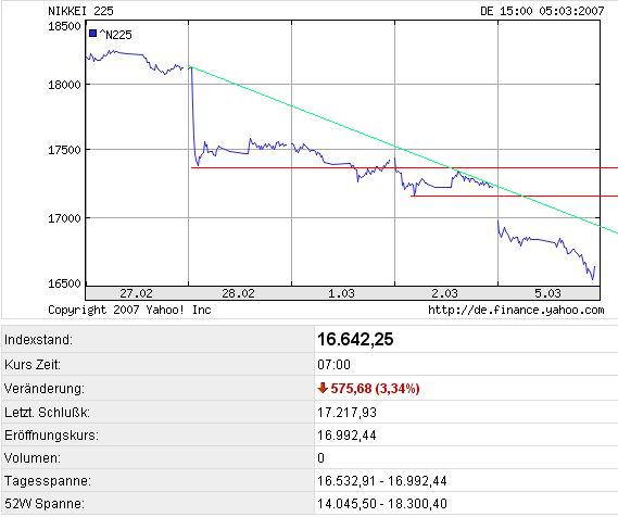Der 225 Werte umfassende Nikkei schloss 3,34 Prozent im Minus bei 16.642 Punkten. Es war der größte prozentuale Tagesverlust seit neun Monaten. Der breiter gefasste Topix verlor 3,42 Prozent auf 1662 Zähler. Ähnlich sah es an den anderen Börsenplätzen aus: In Südkorea ging es 2,7 Prozent bergab und in Hongkong knapp drei Prozent. Taiwan verlor 3,74 und Singapur gar 4,5 Prozent.