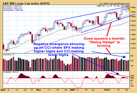 A "Bearish Rising Wedge" pattern that started in early January appears to be in force. "Bearish Rising Wedge" is a gradually rising market where the bottom boundary lines and top boundary lines meet out to an apex. As the market rises volume gradually decreases. Rising Wedge patterns shows energy (Volume) weakening as the market rises. This pattern a lot of the time shows up in the Elliott 5th wave pattern. CCI is also showing a negative divergence as the SPX is gradually rallying the CCI is making lower highs and a bearish sign. There are time cycles for a turn coming in form March 9 to 14 and the SPX could hold up tell then. The next decline will correct the rally phase that started from the 2002 low and will be the biggest correction that has been seen from the 2002 bottom We are short the $SPX at 1381.95. Our longer term target on the SPX is the 1140 range.