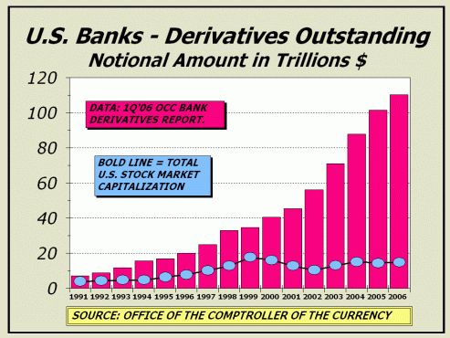 "At the end of 2006, FDIC-insured institutions had $132.2 trillion in notional amount of derivatives, up 29.7% for the year. The bulk of this is held by the big banks."