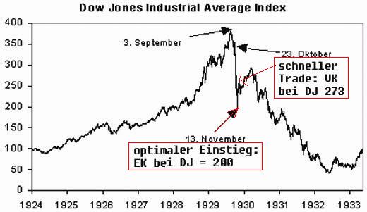 1929 fielen der DOW zunächst 3 Wochen lang von 380 bis 350, eher er sich innerhalb von zwei Tagen halbierte: